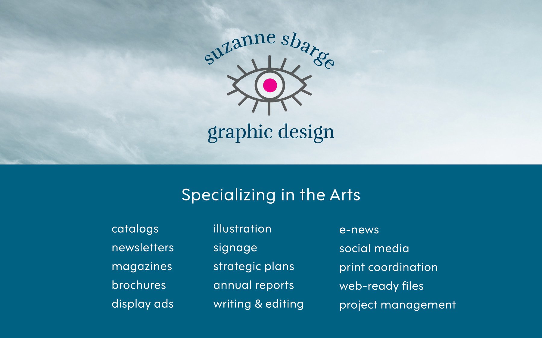 Suzanne Sbarge offers a range of design and marketing services for organizations, museums, galleries, businesses, and artists. Recent clients include Albuquerque Museum, BOMB magazine, Clare Hertel Communications, Hecho a Mano, National Institute of Flamenco, Ogden Contemporary Arts, University of New Mexico Press, and STEMarts Lab, among others, as well as individual visual and musical artists.